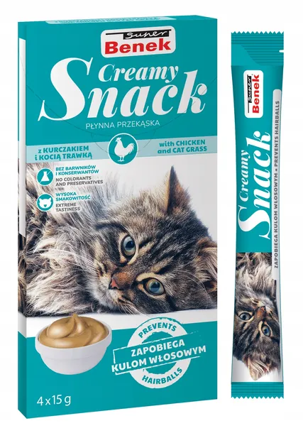 Zapewnij swojemu kotu zdrowie i radość, wybierając SUPER BENEK Creamy Snack z kurczakiem i kocią trawką! Ta smaczna i łatwo przyswajalna przekąska nie tylko zadowoli kocie podniebienie, ale również wspomaga trawienie i pomaga w zapobieganiu tworzenia się kul włosowych.