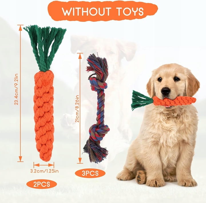 - Zawartość: Otrzymasz 5 zabawek dla szczeniąt, marchewkę o wymiarach 20 x 3,5 cm oraz plecioną linę o wymiarach 23 cm. Odpowiednie dla szczeniąt i małych psów, kolorowe, zapewnią Twoim futrzanym przyjaciołom niekończącą się zabawę.